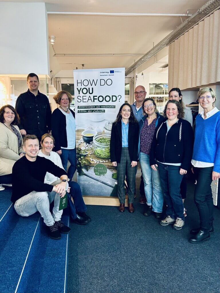 I november fik projektpartnerne oceanBASIS og CRM besøg af medarbejdere fra de forskellige Interreg-institutioner fra Bruxelles, Kruså og Kiel. oceanBASIS præsenterede AlgaeFood-projektet, forklarede hvorfor tang hører hjemme på enhver tallerken og overbeviste også deltagerne med forskellige tang-delikatesser, såsom friske osteruller i en sukkertangbelægning eller sprøde tangchips. Dette blev efterfulgt af en gensidig udveksling om de udfordringer, der stadig findes med hensyn til tang som fødevarer.